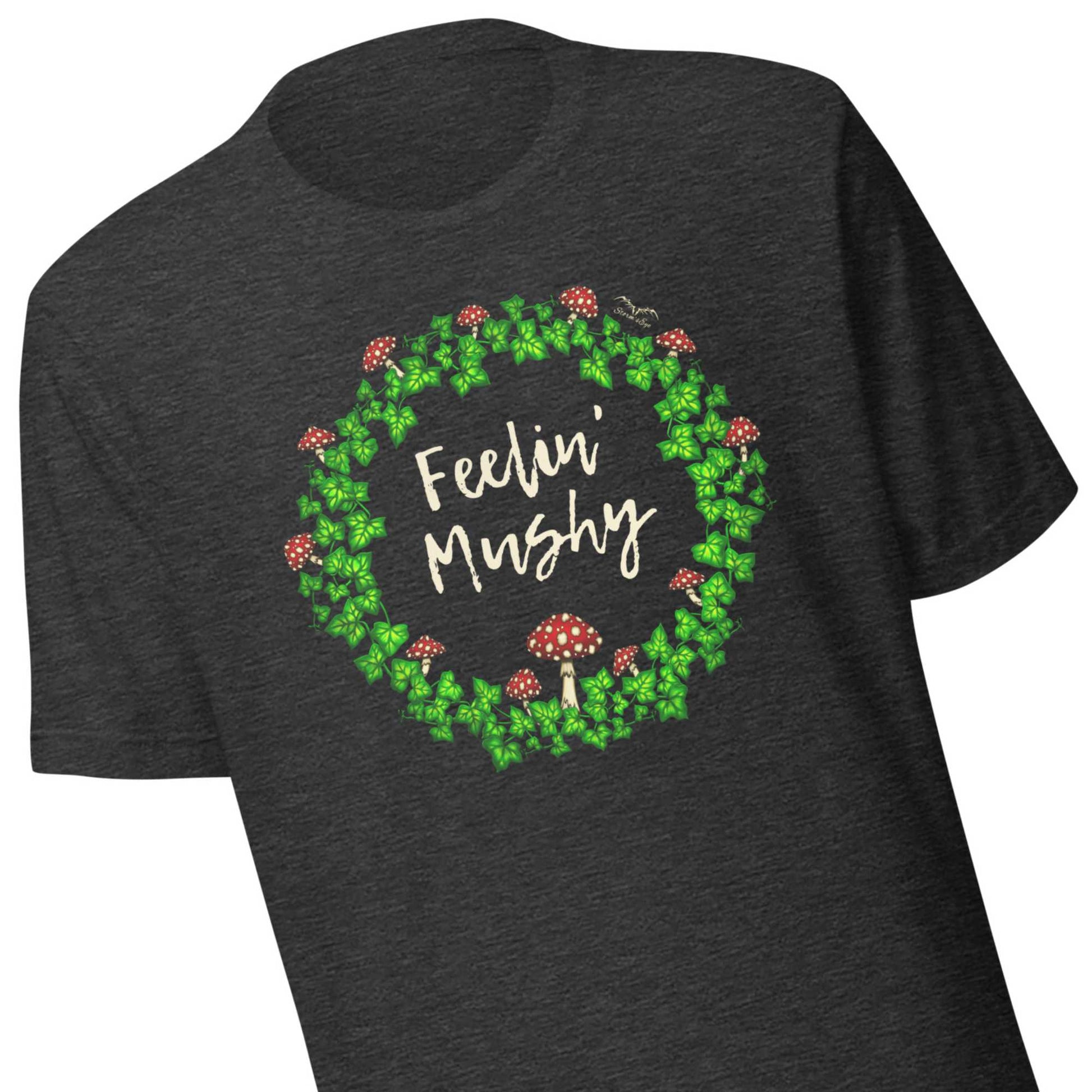 100% cotton 'Feelin' Mushy' mushroom lover graphic shirt in 8 colours - cottagecore fairy ring design with fly agaric toadstools, foliage and 'Feelin' Mushy' slogan. Art by Stormseye.