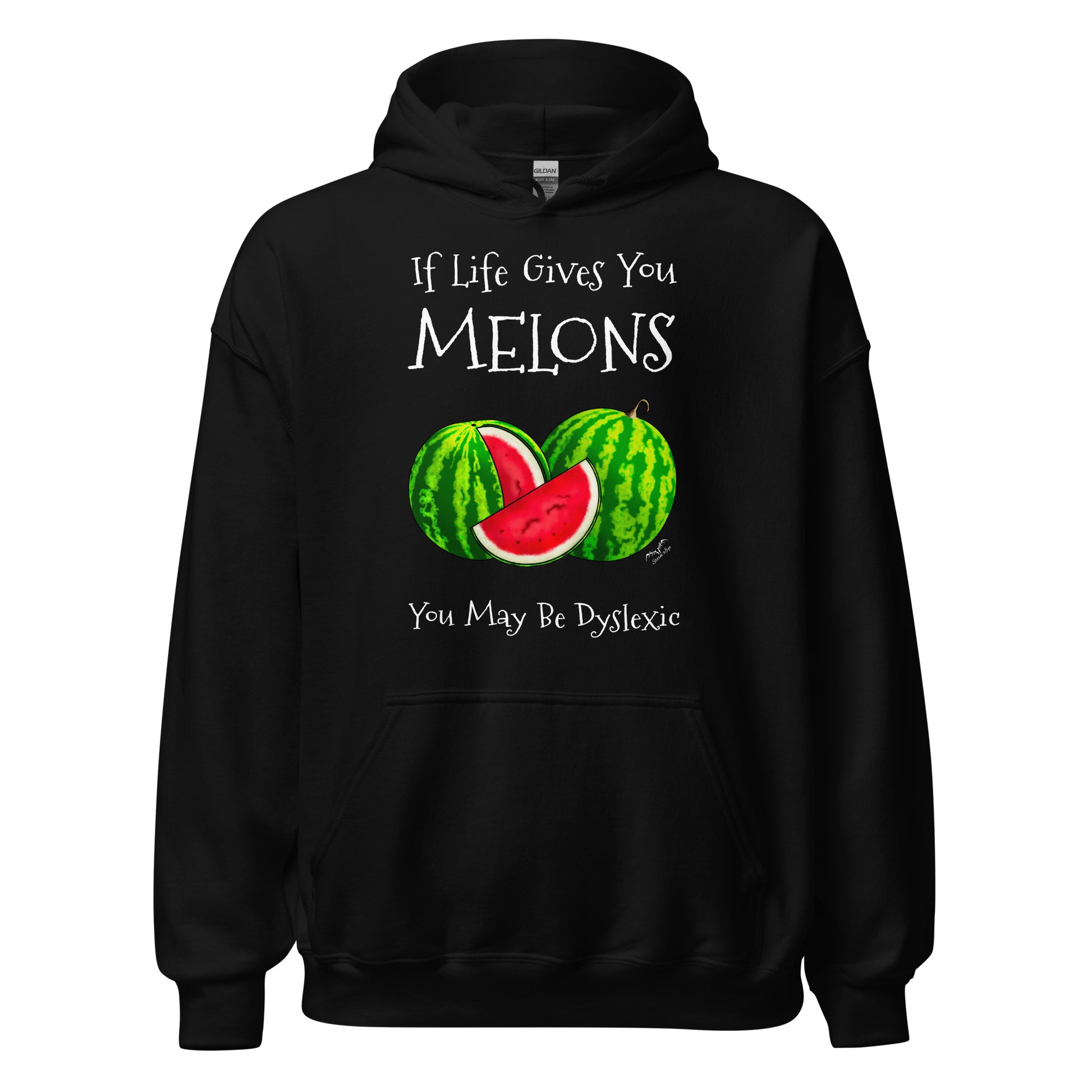 Sweat à capuche drôle Dyslexia Melons - design de pastèques avec le slogan « Si la vie vous donne des melons, vous pourriez être dyslexique ». Pull amusant pour les dyslexiques, excellent cadeau pour un professeur SEN ! Soyez fier de ce qui vous différencie. Sept coloris, tailles S à 4XL.