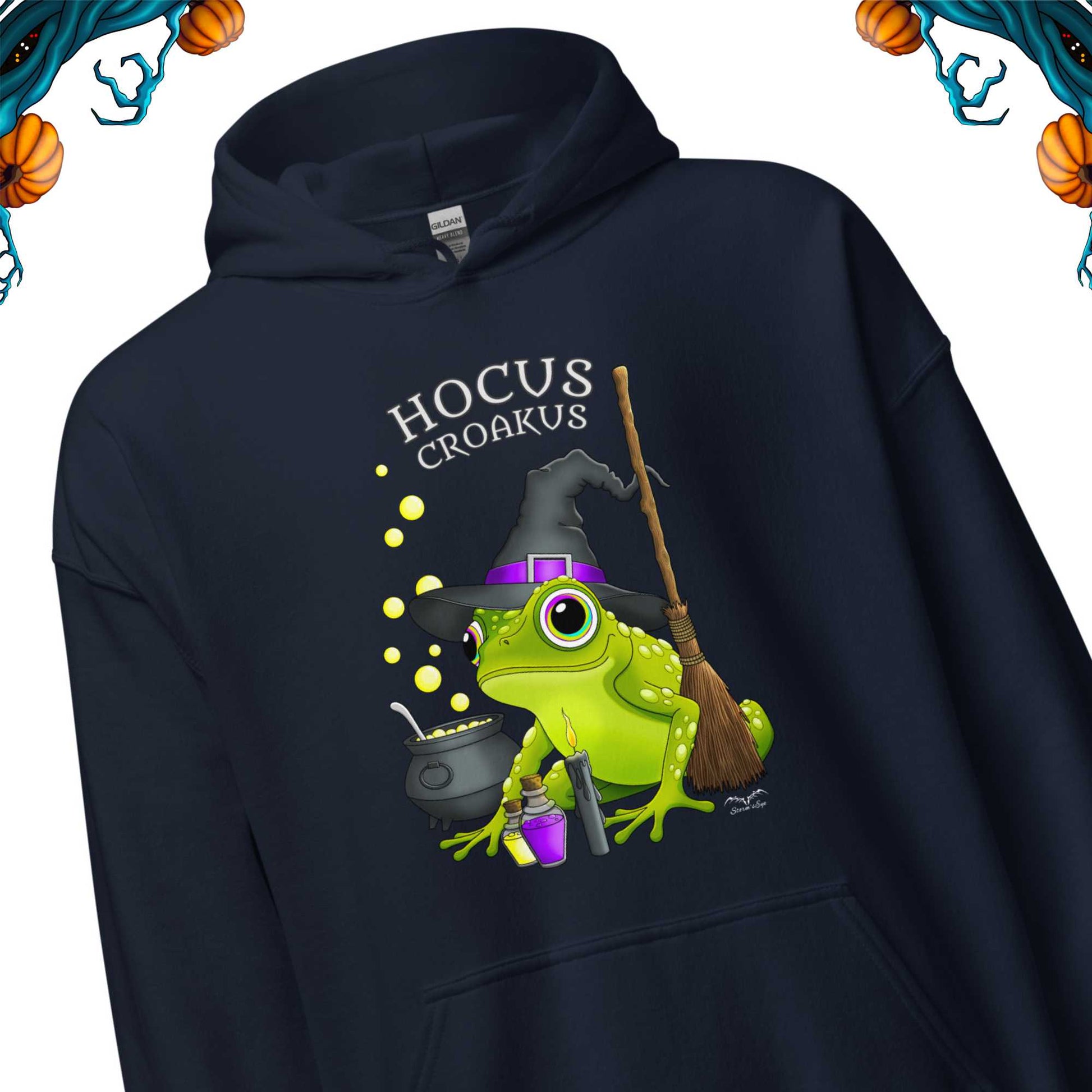 Warm, stretchy, witchy, frog lover hoodie in 8 colours - adorable witch frog design with cauldron, broom, candle, potions and ‘hocus croakus’ slogan. Art by Stormseye.